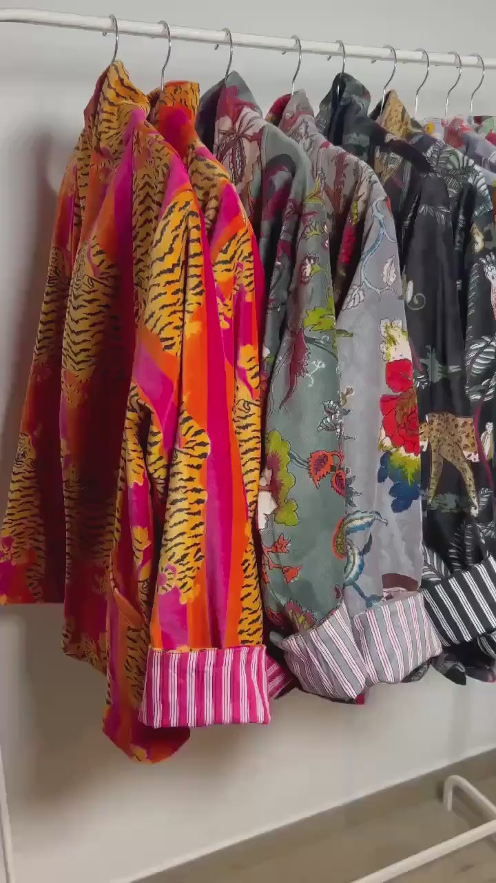 Giacca artigianale realizzata in velluto di cotone di alta qualità, interamente foderata in cotone stampato a mano con l’antica tecnica del block print.